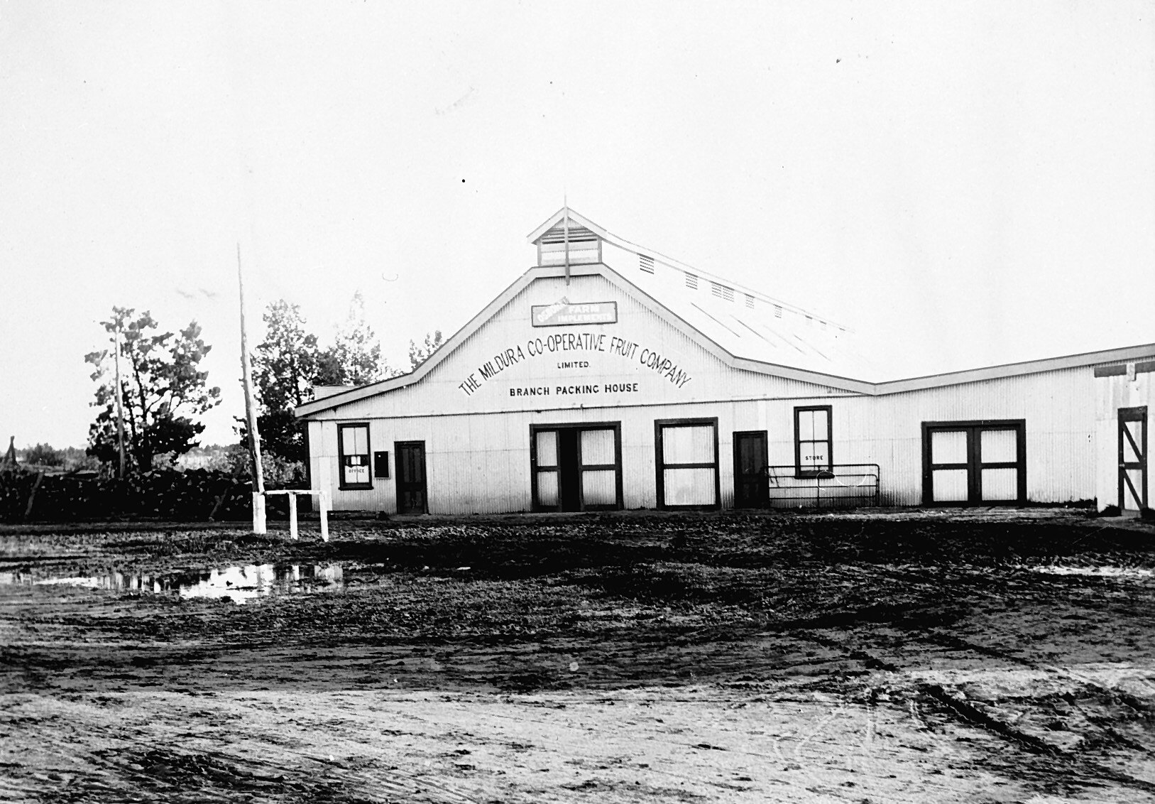 The branch packing house of the Mildura Co-operative Fruit Company Ltd. Above the name on the facade of the building is a sign Osborne Farm Implements.
