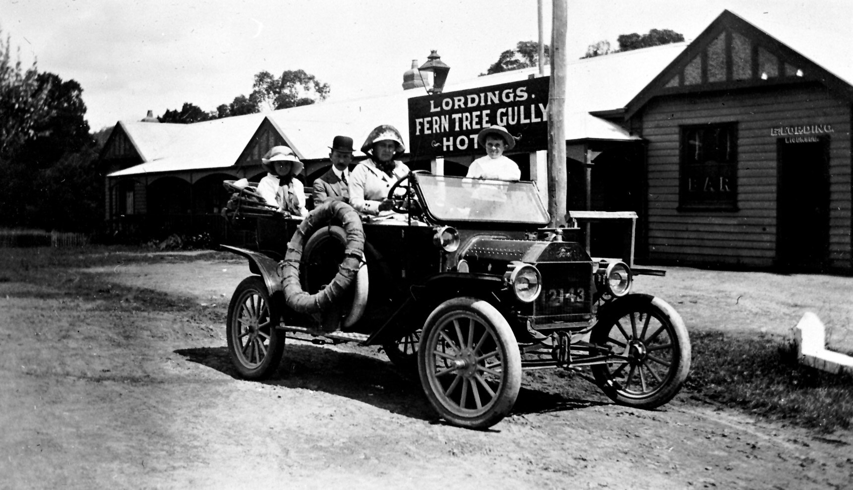 Tourists in a Model T Ford motor car outside Lording 's Ferntree Gully Hotel.