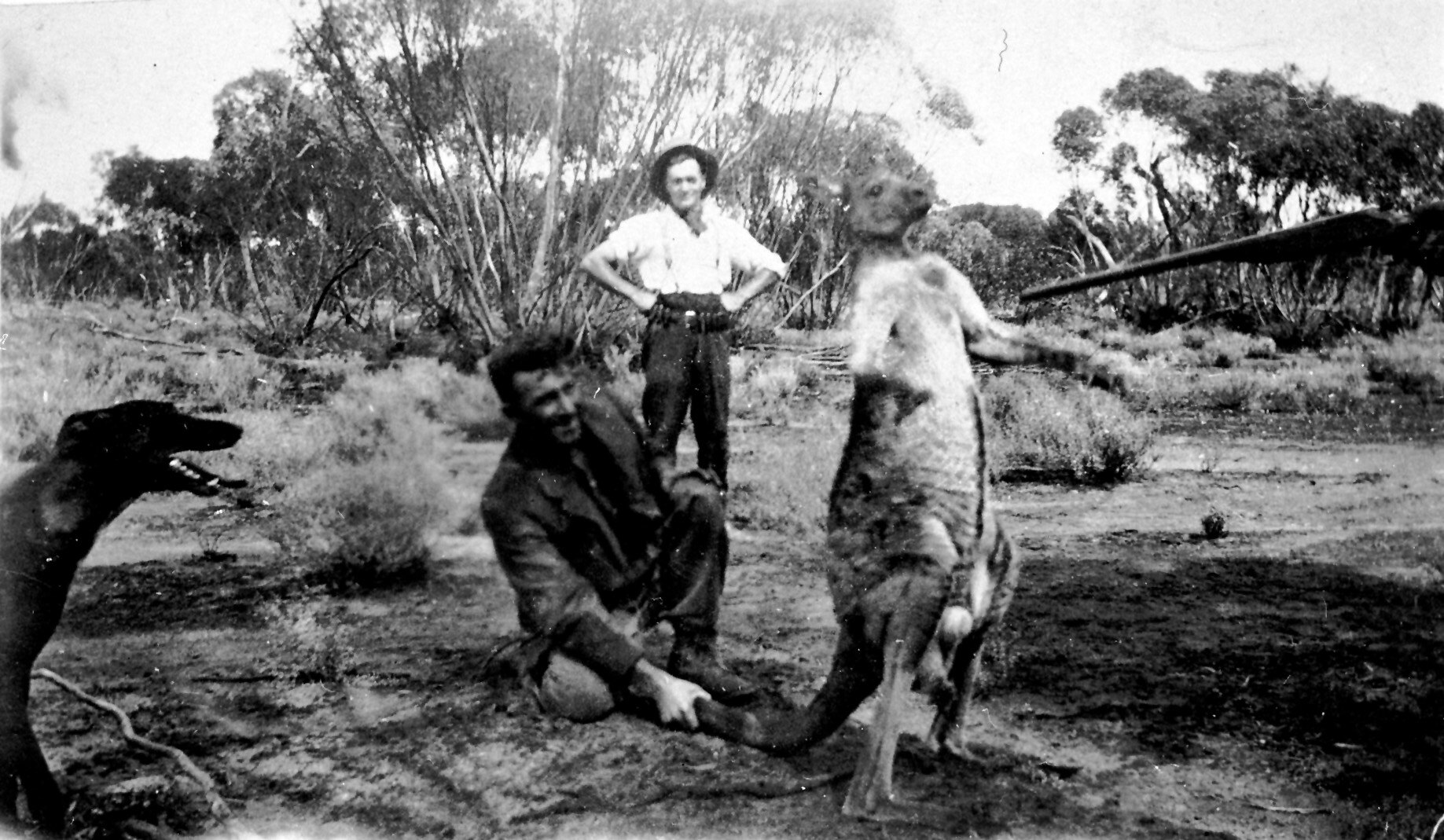 A kangaroo which is being held by the tail by one man while another, out of the photograph, is aiming a gun at it. A third man is in the background and a dog on the left.