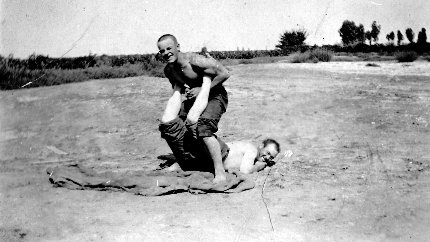 Two men wrestling.
