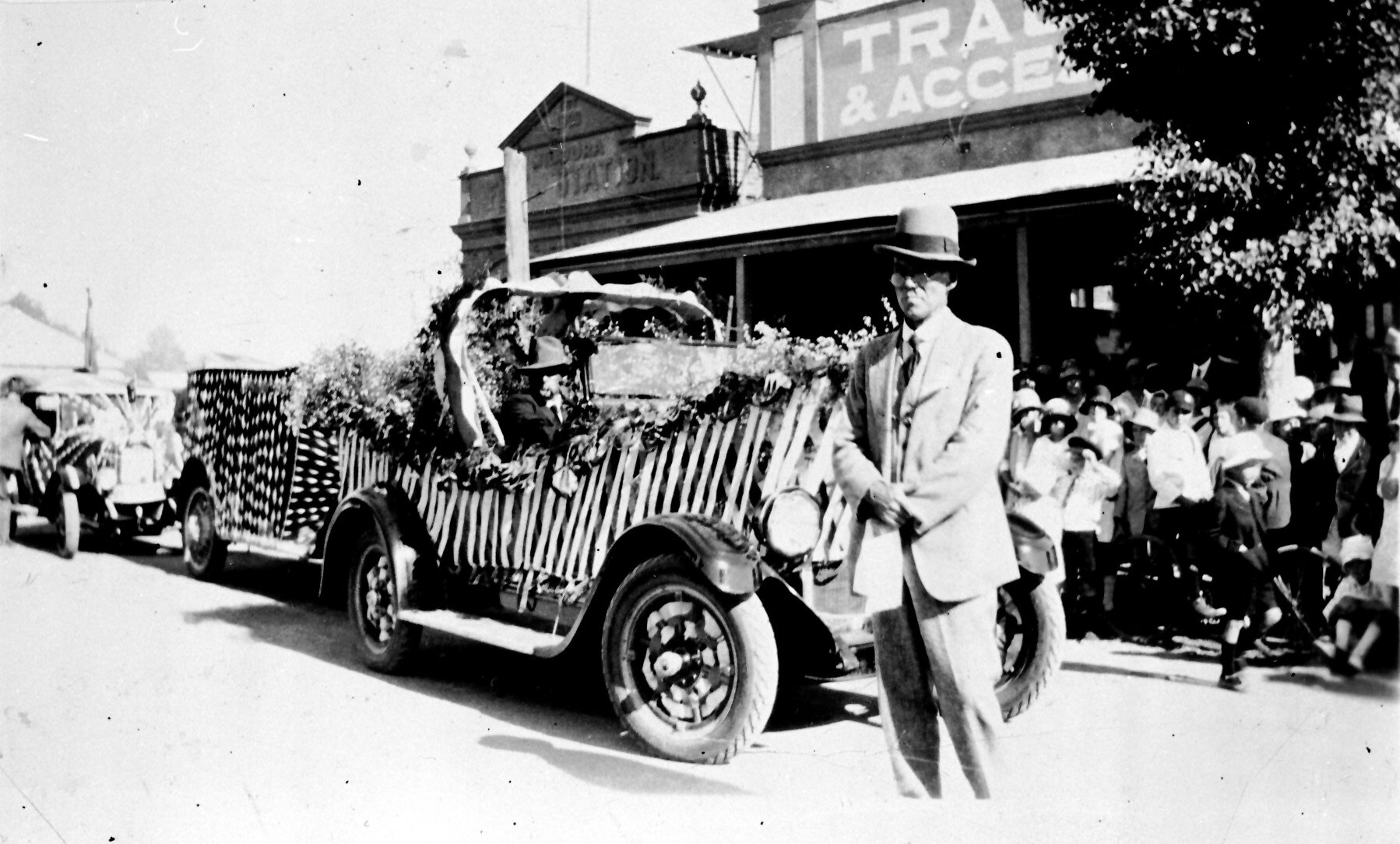 A parade of decorated cars. The Mildura Fire Station is in the background.
