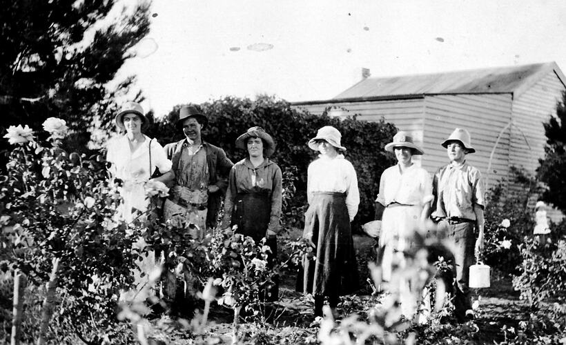 A group of grapepickers about to commence work. They are standing in a rose garden.