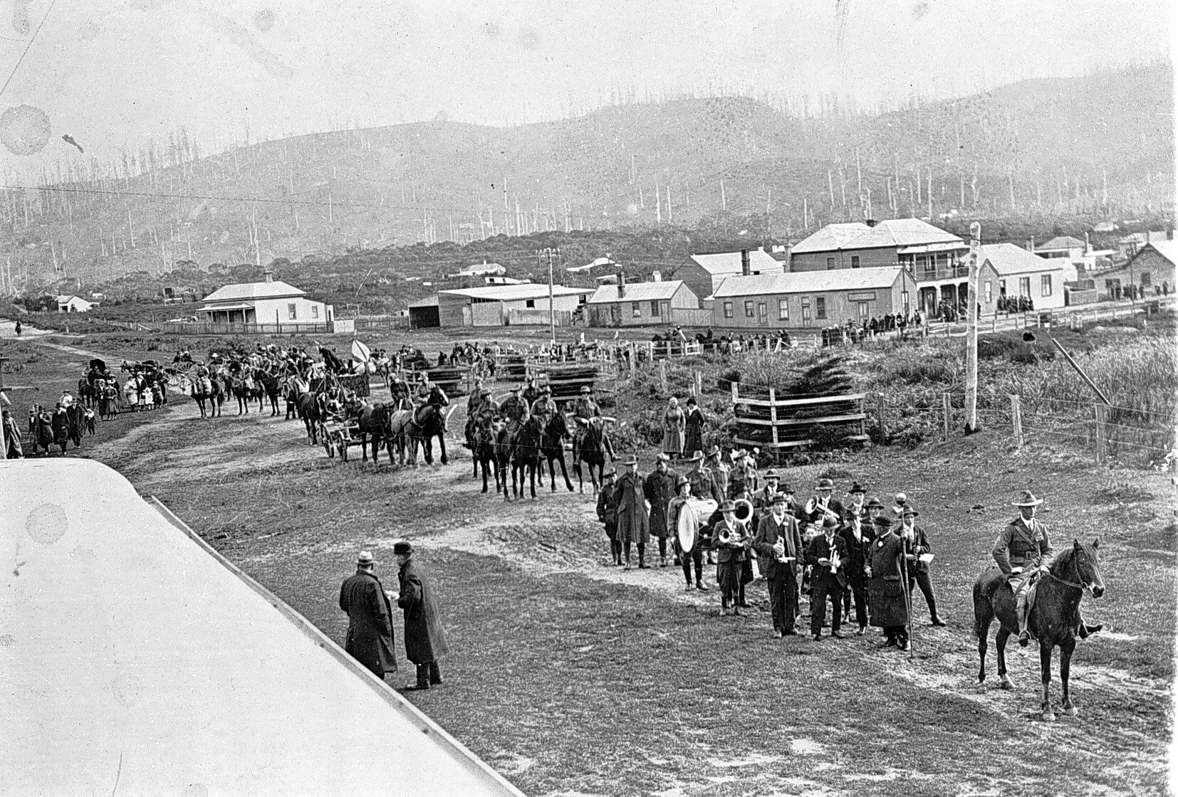 A peace day procession through a country town. A man on horseback leads the procession, followed by a brass band.