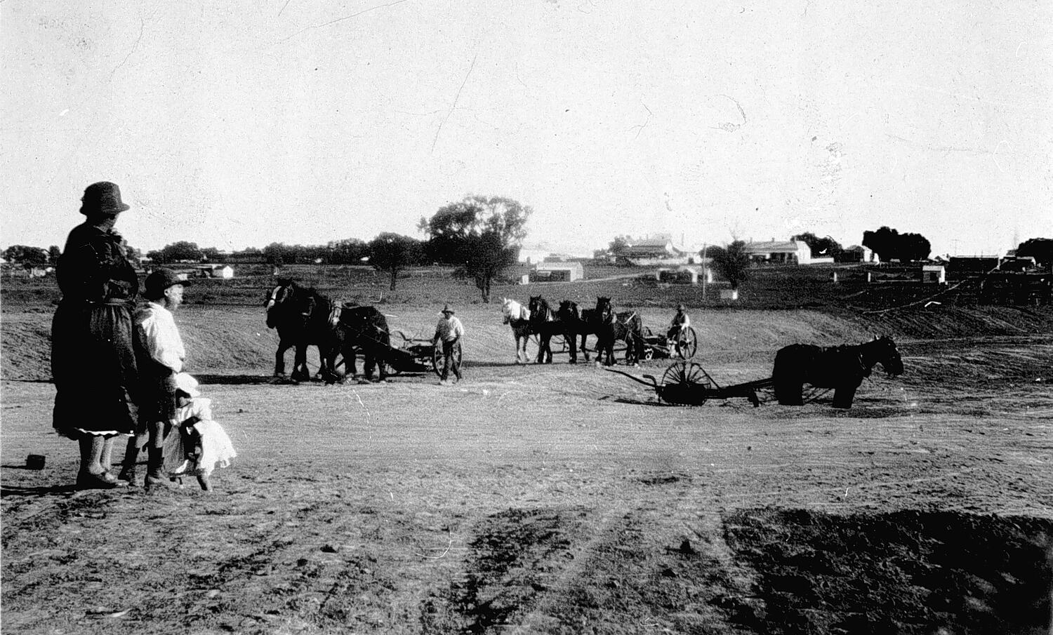Scooping earth with a monkey scoop beside a bridge. A woman with a small boy and a toddler are on the left Two horse-drawn scoops are in the back- ground and one on the right.
