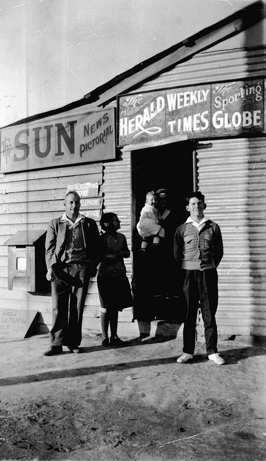 A group of people outside the Boonoonar post office and store.