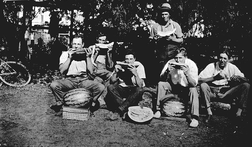 Men eating water melons on a property owned by G.A. McCracken.