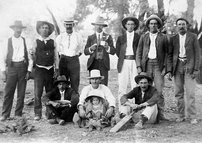 Members of a cricket team. The man in front holds a small girl.
