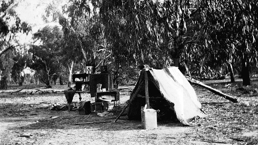 A sleeper cutter 's camp. To the left of the tent is a table and shelving (?) which appear to hold his supplies.