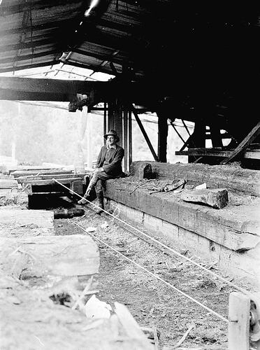 A man sitting inside McDonald 's Mill. There is a rail trolley beside him which appears to be moved by a winch in the foreground.