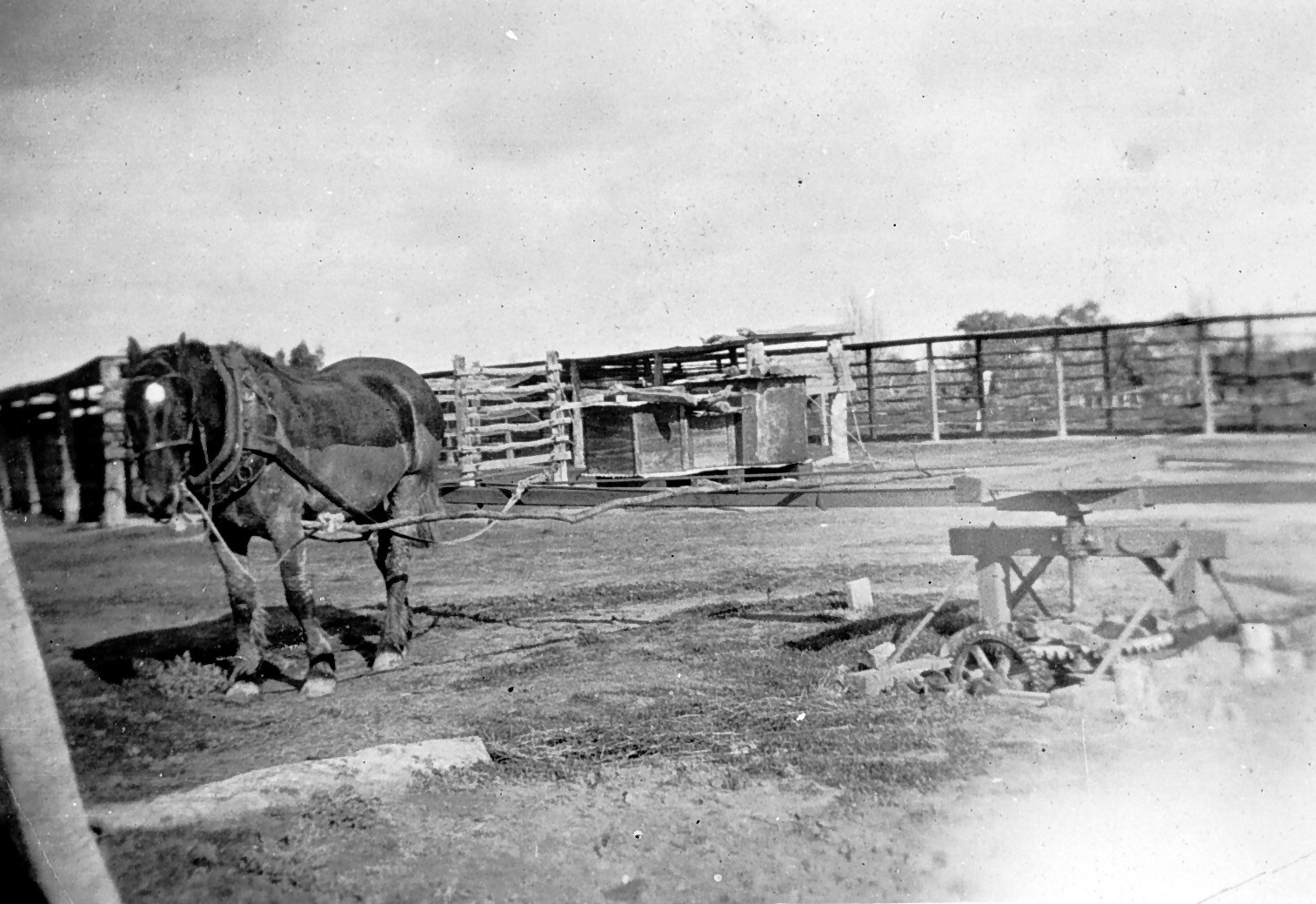 A horse-powered pump. The power is provided by the horse walking in a circle whilst harnessed to the arm of the machine. It is probably pumping water. There are drying racks in the background.