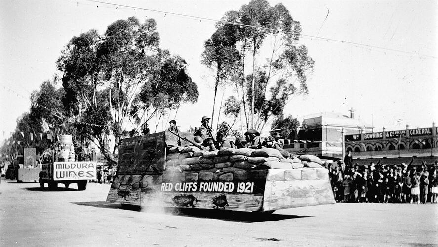 Floats in a parade. The float in front bears the sign 'Red Cliffs founded 1921' and has men in military uniform behind sandbags. The float behind advertises Mildura wines.