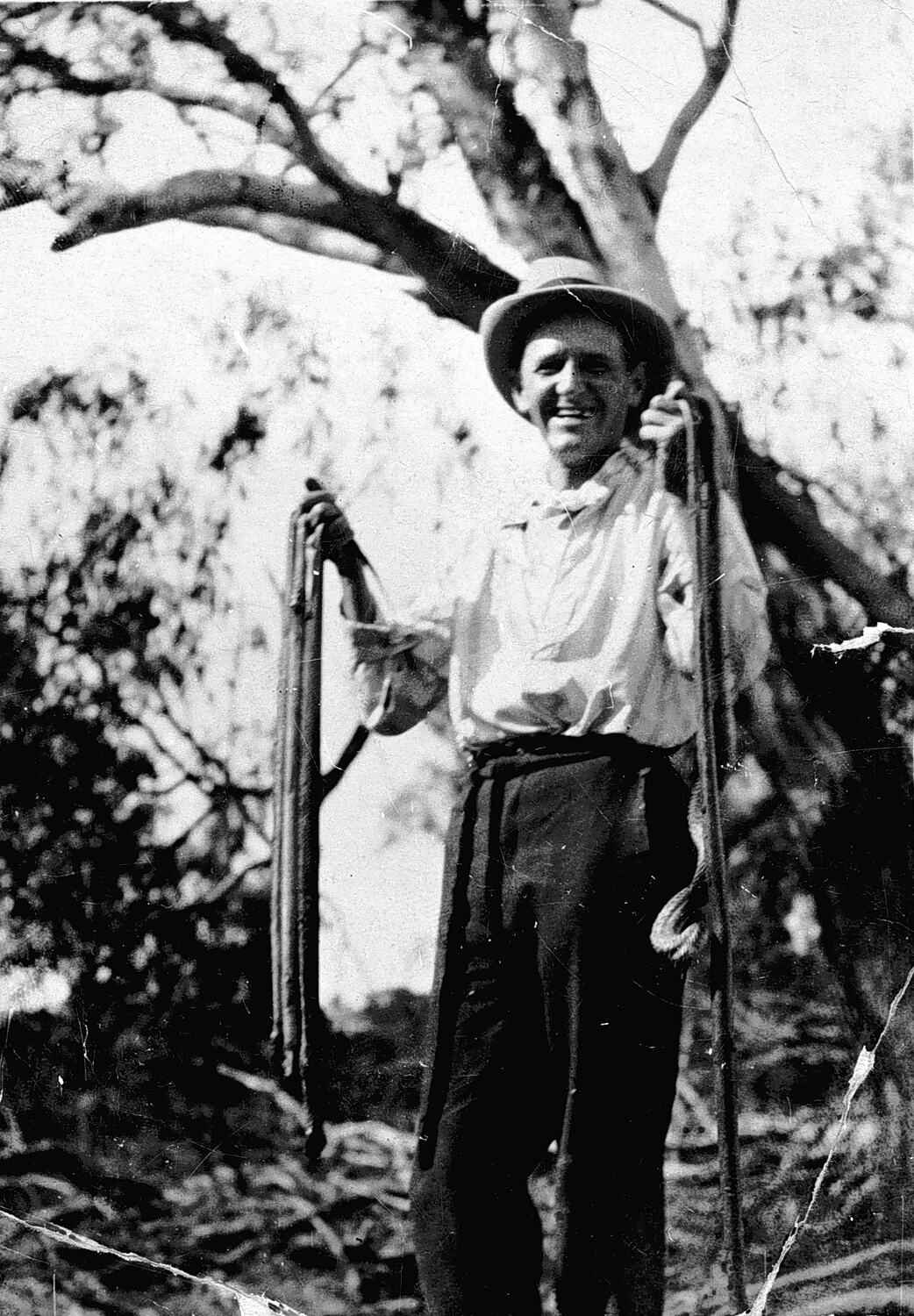 A man holding five snakes.