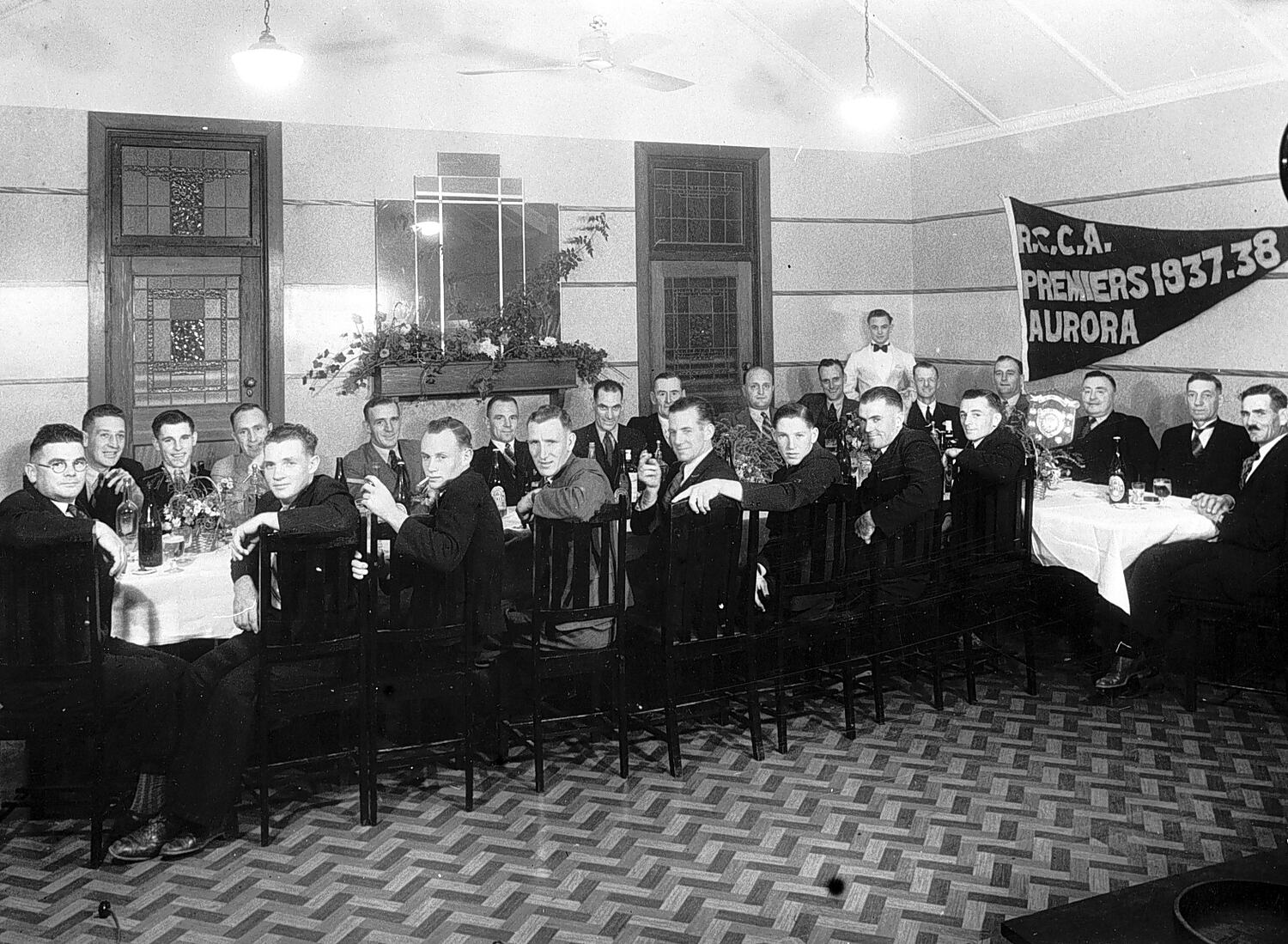 Club members at a victory celebration dinner at the Aurora Cricket Club. They had won an inter packing shed competition. There is a pennant marking the Aurora Cricket Club 's premiership in 1937-38 on the wall.