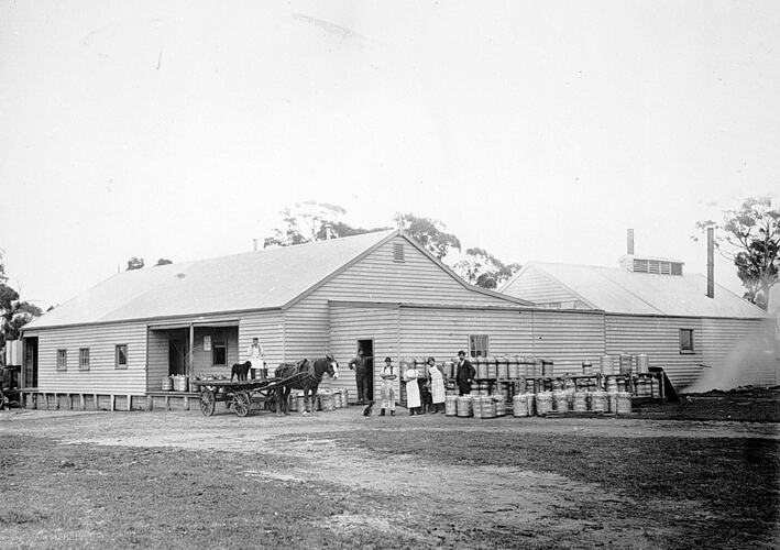 Staff members outside the Lang Lang Butter Factory. There is a horse-drawn dray by the side of the building and a number of milk cans.