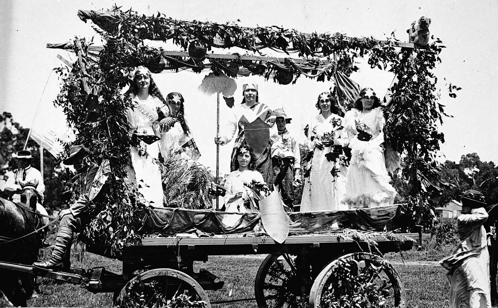 A decorated wagon carrying a woman dressed as Britannia (?). She is flanked by her attendants. The driver of the wagon appears to be in military uniform.