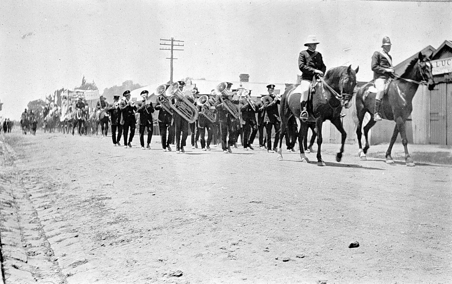 A procession led by two mounted policemen and followed by a band.