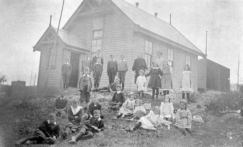 Boys and girls and a female teacher in front of a weatherboard school building. The teacher and some children are standing at the back, while other children are sitting and lying down in front on the grassy slope. Several girls or womens hats are lying on the ground near the children. The building has a small vestibule at front with a door at right and windows in front, and fretwork in the roof gable. The main part of the school has three windows at right, and one at front, and two chimneys on the roof. There is a pole in the ground at the front of the building. Another building is visible at the back of the school, which appears unfinished, but may be a toilet block. It has a pole emerging from the roof.