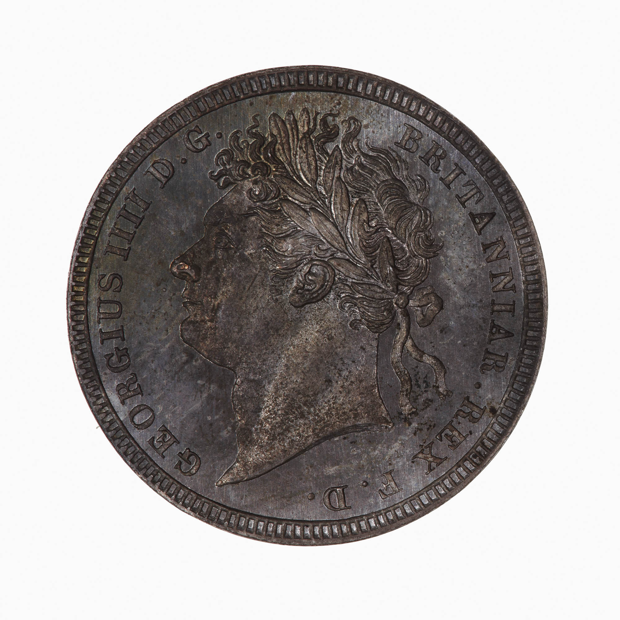 Laureate head of the King facing left; around, GEORGIUS IIII D. G. BRITANNIAR. REX F. D.