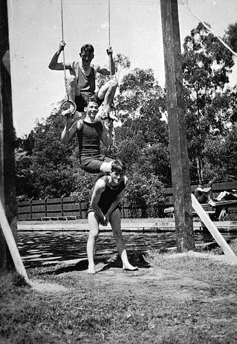 Three boys in bathing costume, two are hanging from gym rings resting on the shoulders of the third boy. There is a swimming pool behind them.