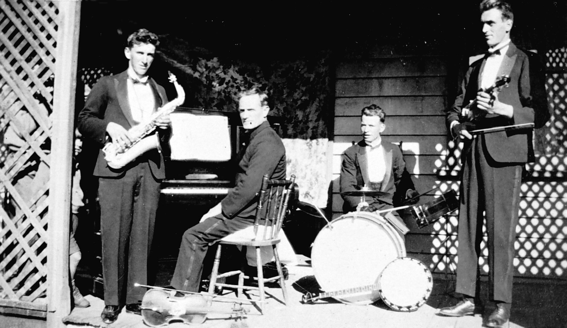 Four band members on the verandah of a house. They wear dinner jackets and the band instruments include a saxophone, a piano, drums, a banjo and violins.