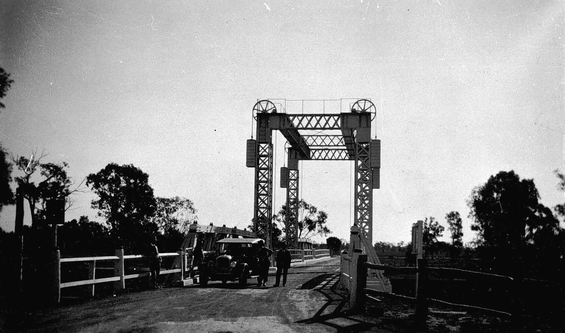 Men beside a car on the Tooleybuc bridge over the Murray River.