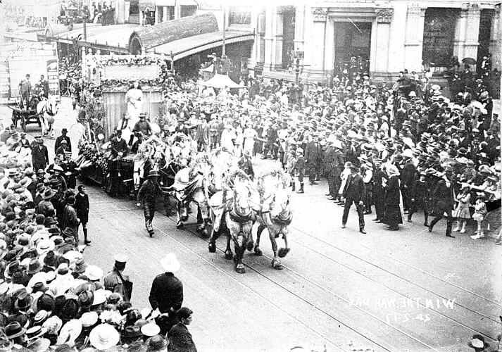 Photograph depicting a 'Win the War Day' procession, held in Melbourne on 24 February 1917. The procession moved from Princes Bridge, along Swanston Street, up Bourke Street and along Spring Street to the Treasury Gardens. Organised by the State Recruiting Committee, 'The sole object of the demonstration is to fix the attention of the people on the fact that an urgent demand for recruits exists, in the hope that the eligible men may be induced to enlist immediately. Australia promised to provide 16,500 men a month, but so far the enlistments have reached only about 5000, while there are thousands of men fit and capable.' (The Age, 24 February 1917, page 11).