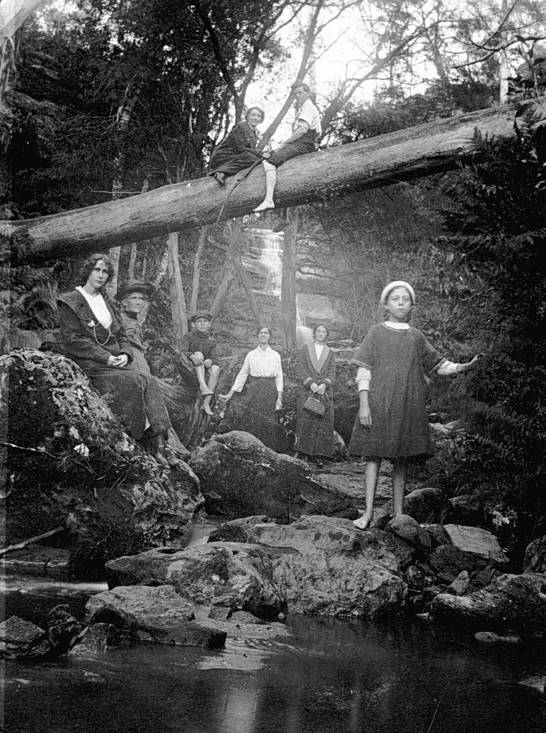Group of people at the waterfall at Fairy Dell. A boy and girl are seated on a log above the group and a young girl stands on a rock in the foreground.