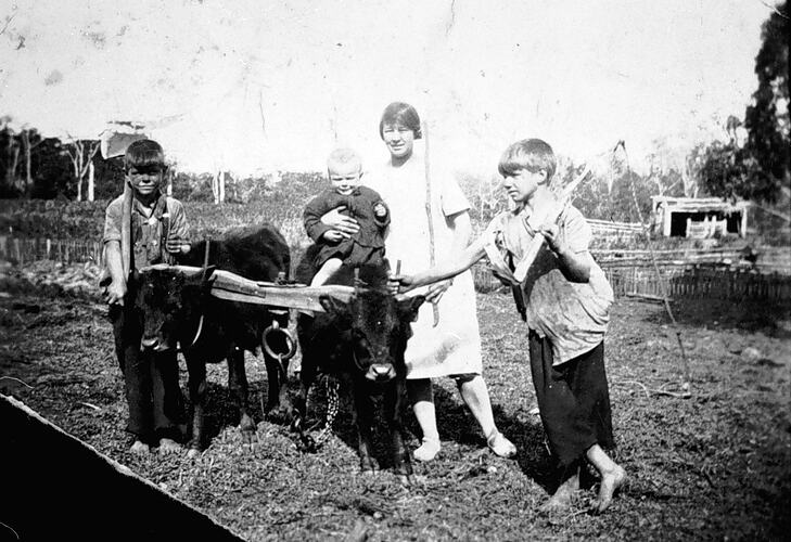 A woman and children with a miniature bullock team. The boy on the left carries an axe while the boy on the right has a whip. The woman is supporting a small child on the back of one of the bullocks.