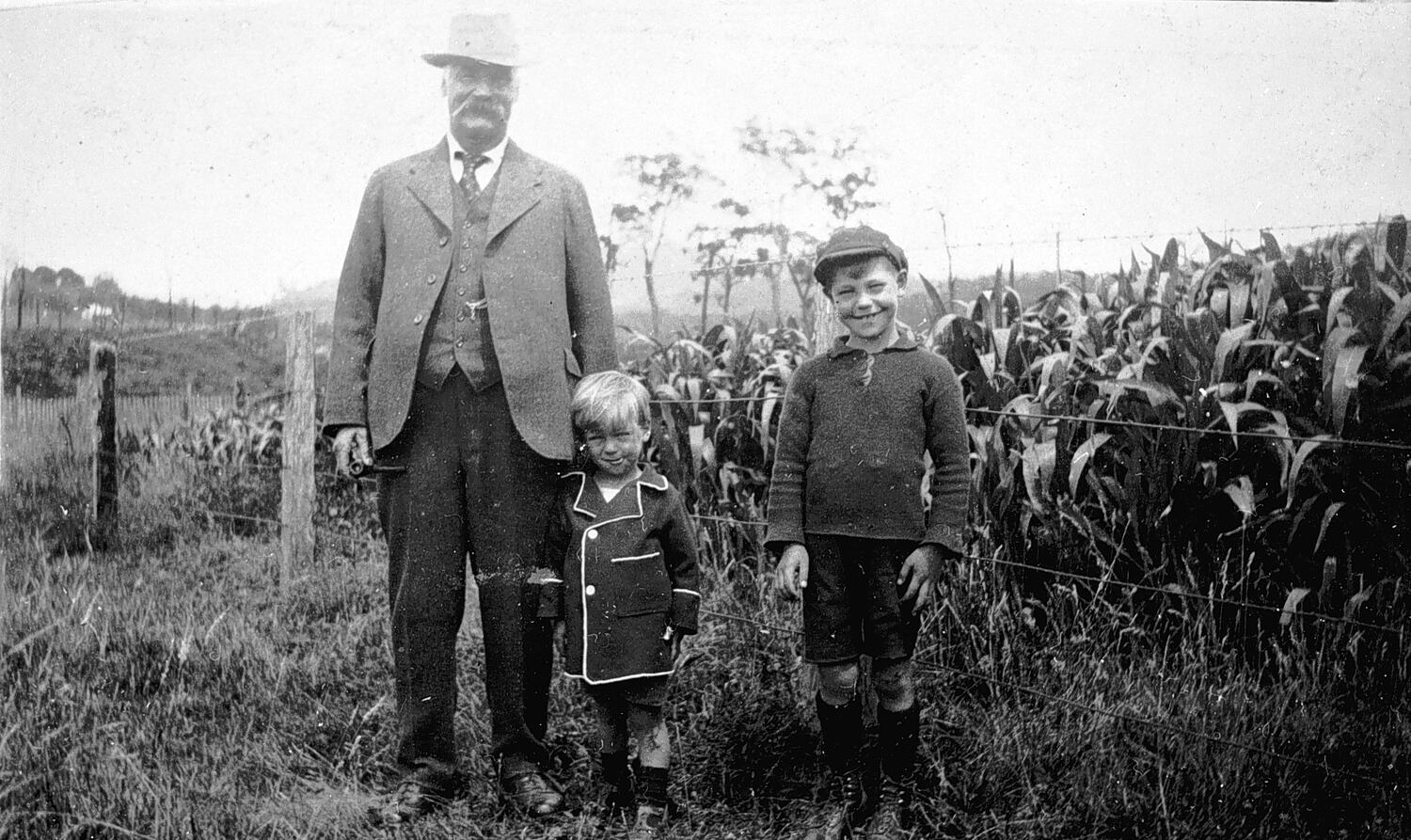 J.G. Thompson and his two sons, Norm and Ollie, in front of a crop of maize. They farmed at Koornalla out of Traralgon.