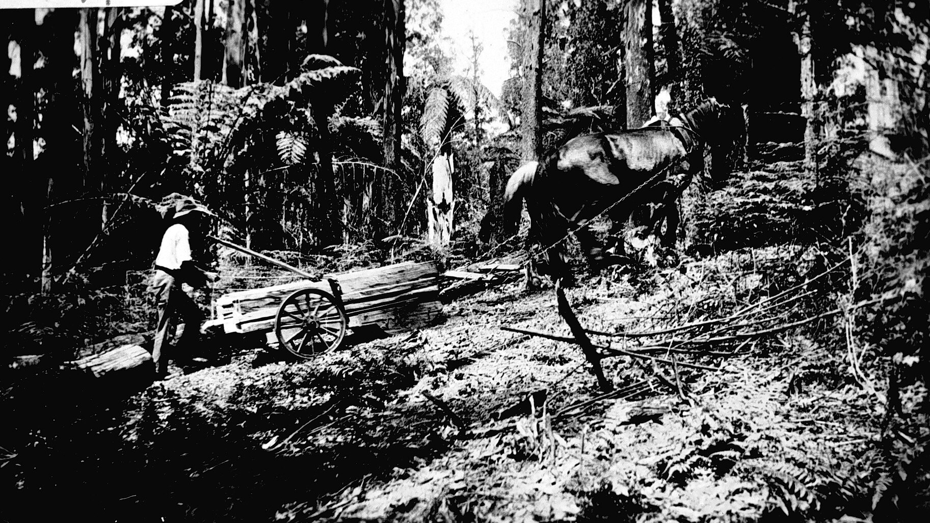 A horse drawing a wagon load of palings in a forest.