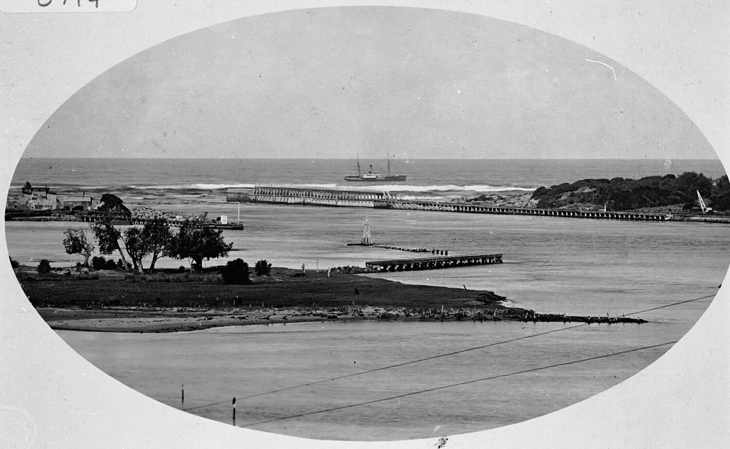 Lakes Entrance. There is a ship offshore.