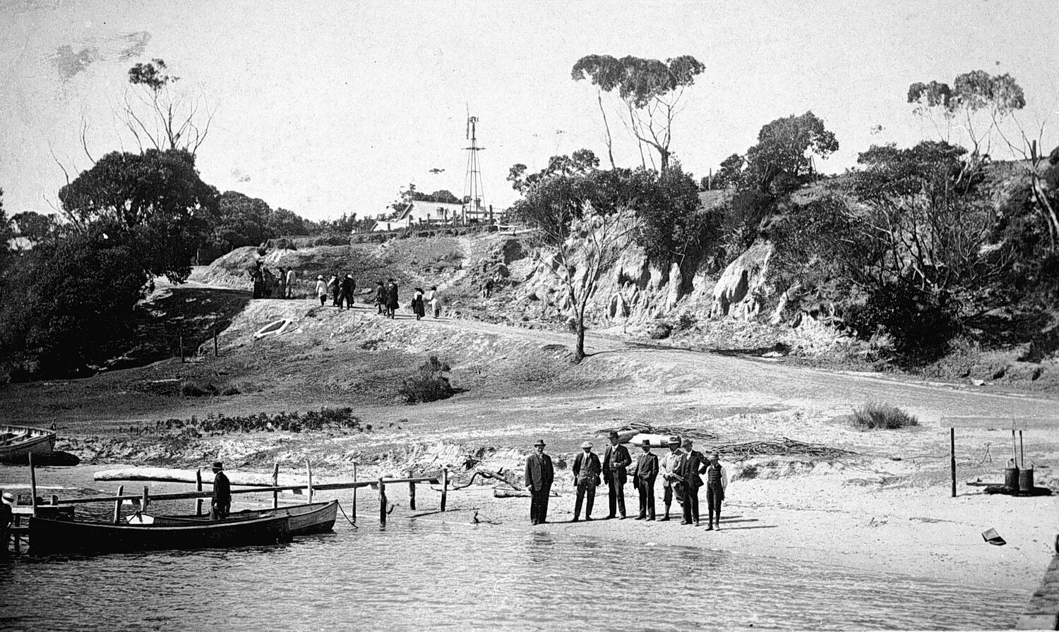 A group of people on the beach at Marlo. There is a boat on the left tied to a small pier.