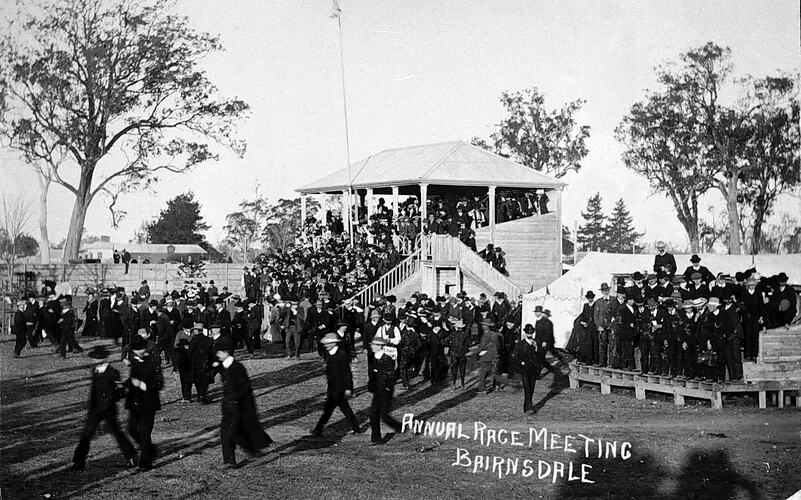 Crowds in and in front of the grandstand at the annual race meeting.