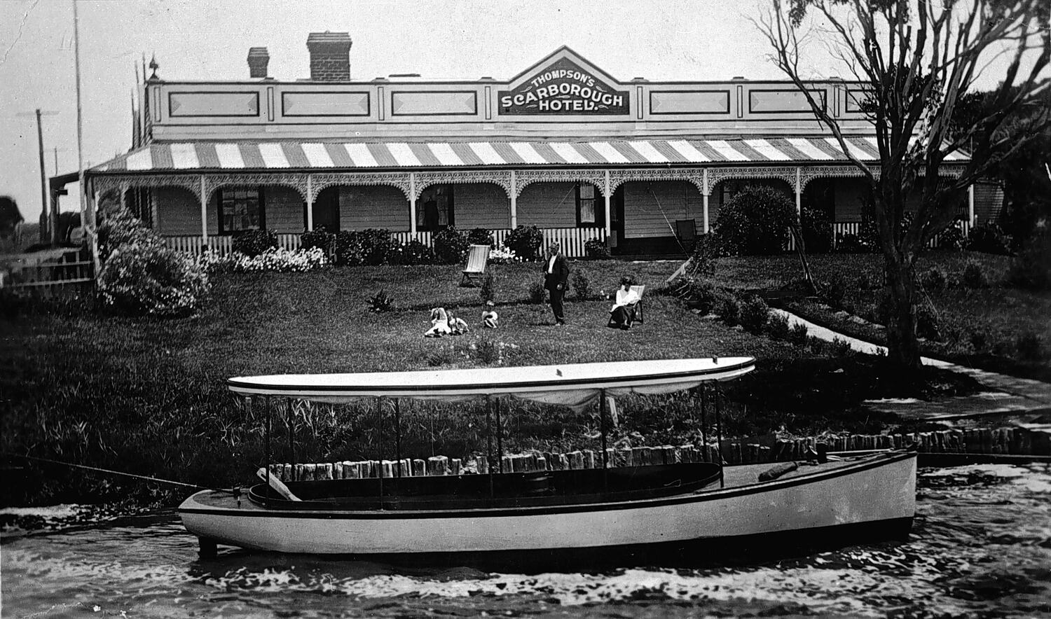 Thompson 's Scarborough Hotel on the Gippsland Lakes. There is a garden leading down to the river and a boat moored at the bank.