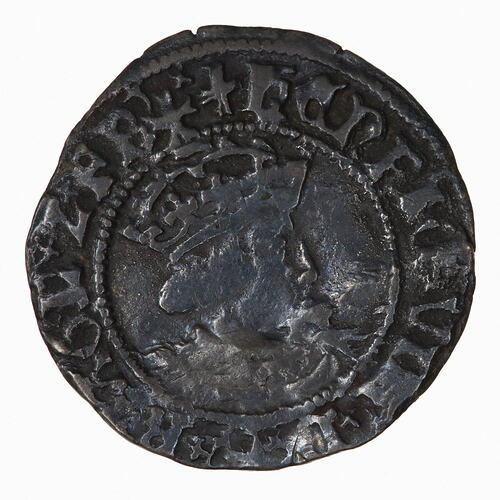 A crowned bust of the King facing right within a circle of beads; around, + (mm voided crossl) HENRIC VIII D G R AGL Z FR.
