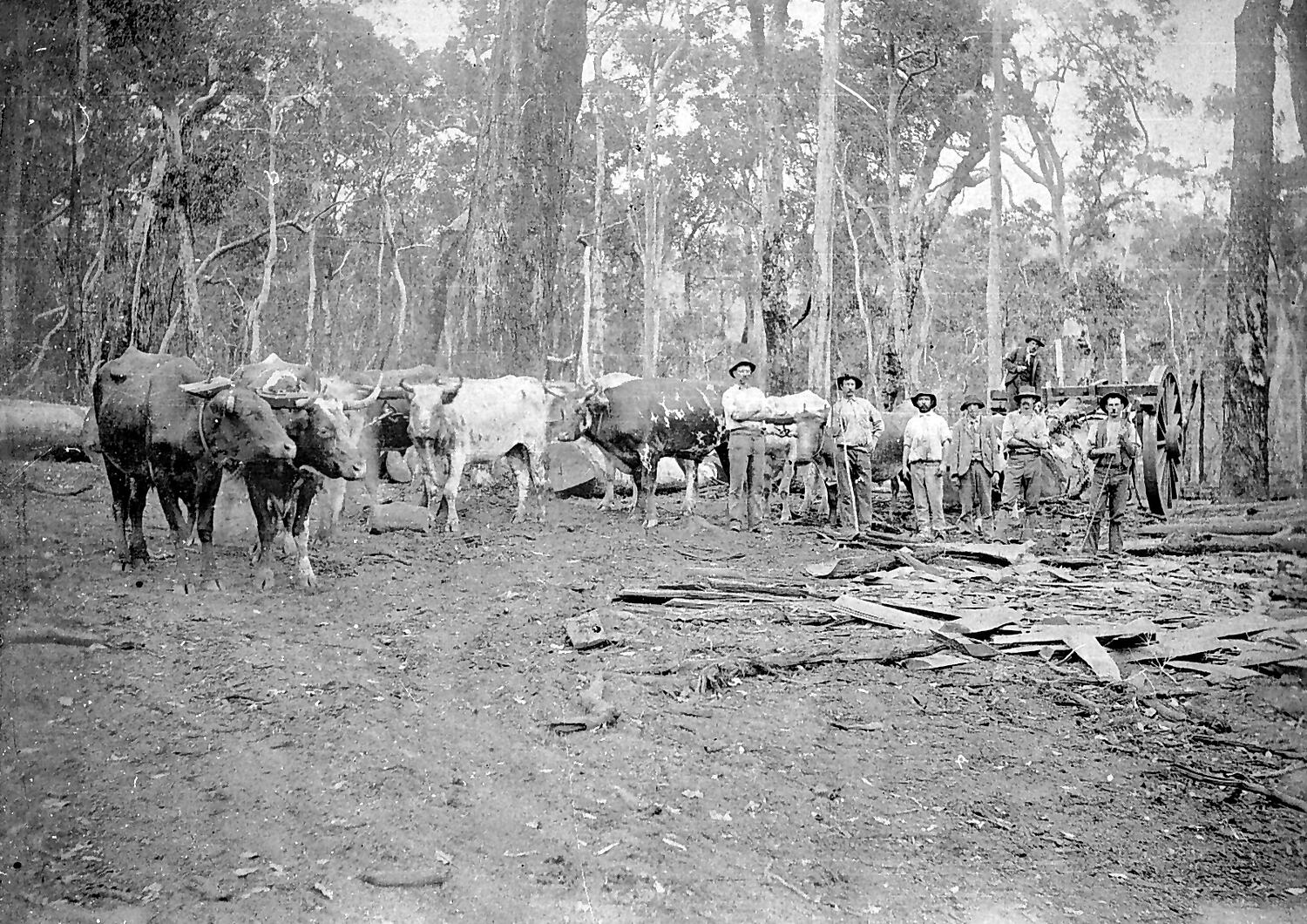 A bullock team hauling a log. The log is suspended from a frame attached to two wheels approximately ten feet in diameter.
