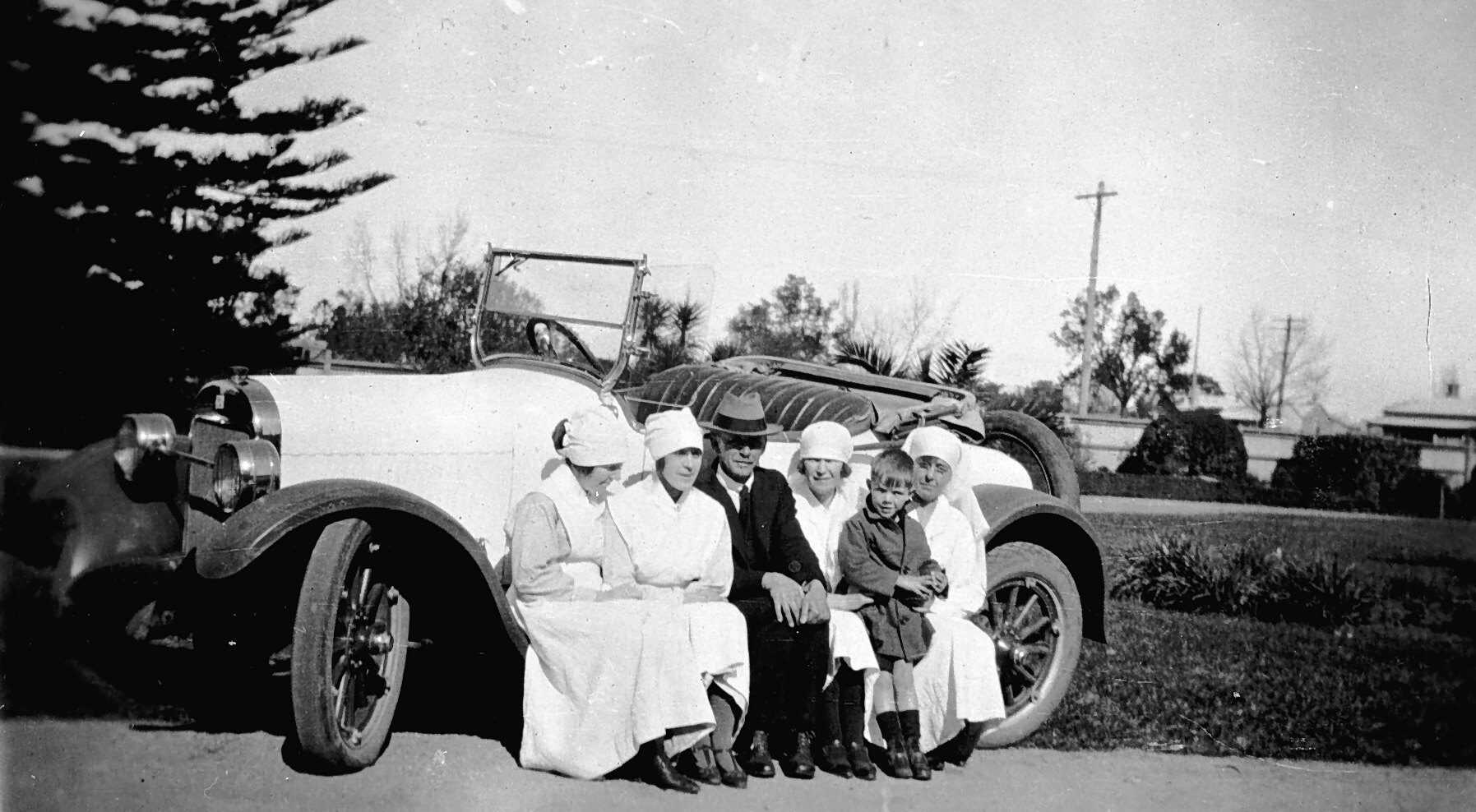 A doctor, four nurses and a small boy seated on the running board of a Buick car outside the Gippsland Base Hospital in Sale.