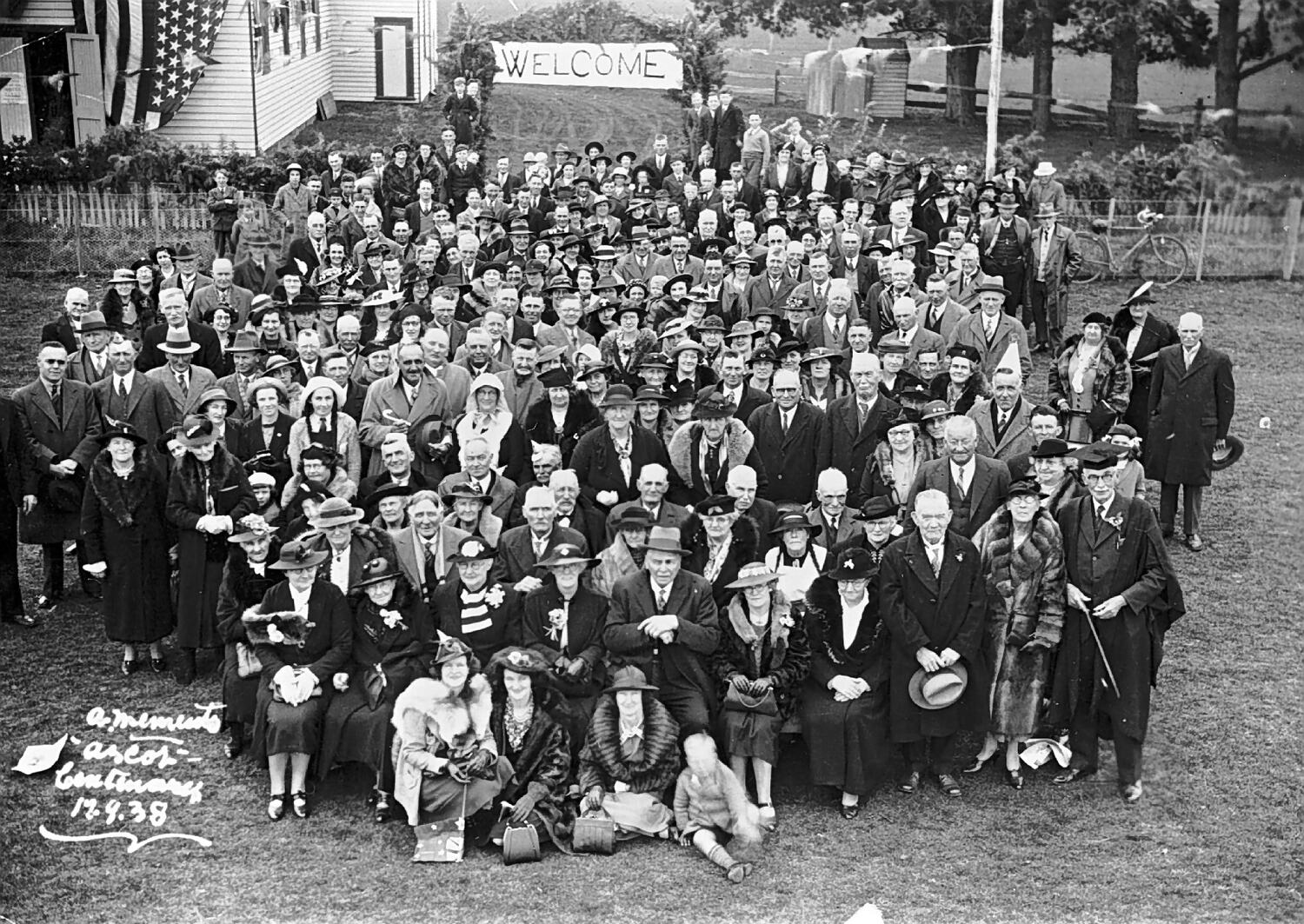 Large gathering at the Ascot centenary celebrations. There is a large 'Welcome' sign behind the crowd and an American flag on the left.