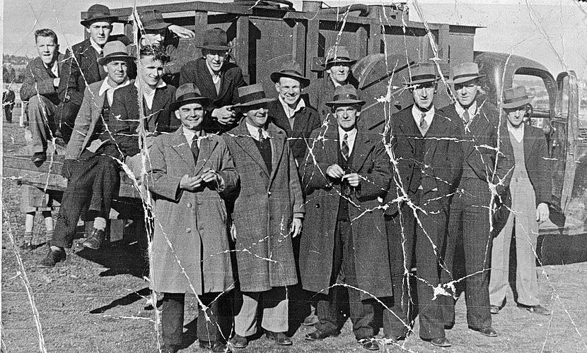 A group of men standing in front of a fire truck. (The photograph is cracked and creased.).