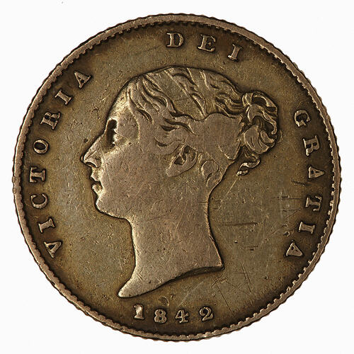 Head of the Queen facing left wearing ribbon in her hair; around, VICTORIA DEI GRATIA; below, 1842