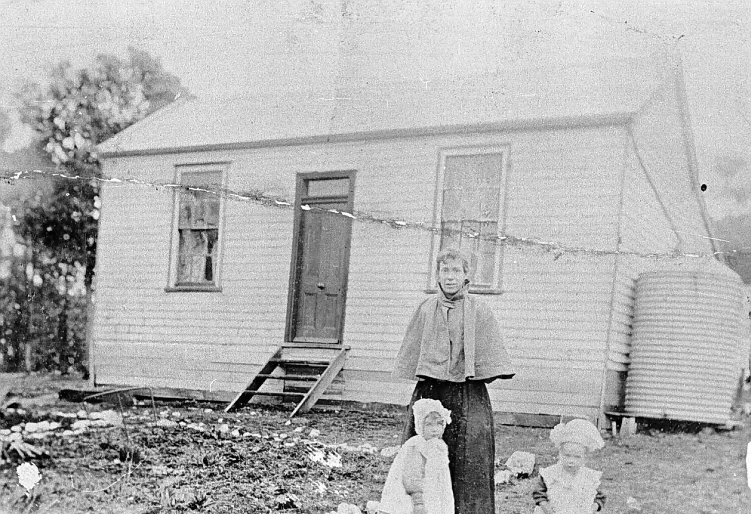 A woman and two small children outside a small wooden house. There are steps up to the front door and a water tank at the side.