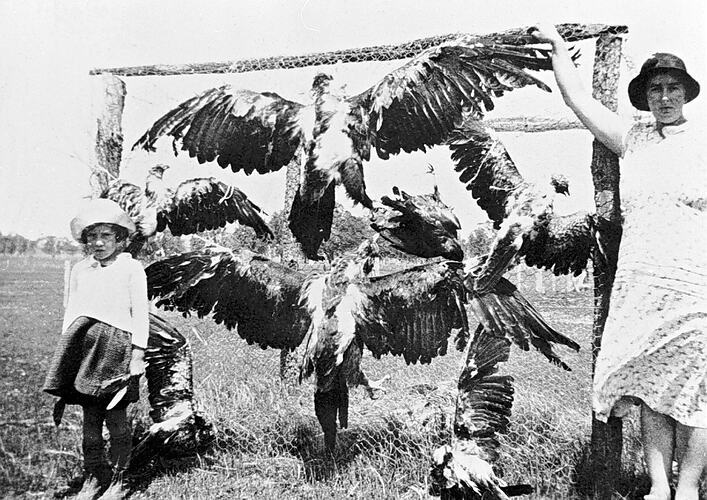 A woman and child with a number of dead eagles hung on a frame covered with wire netting.