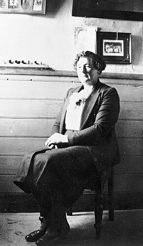 A woman wearing a jacket and skirt, sitting on an upright chair. There are pictures on the wall behind her.