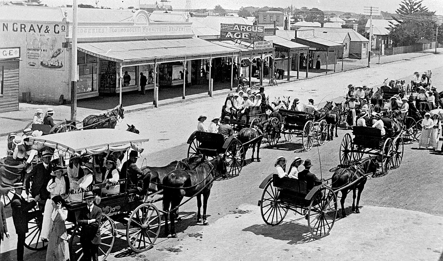 A large group of people with their horse drawn carriages in the main street of Port Fairy.