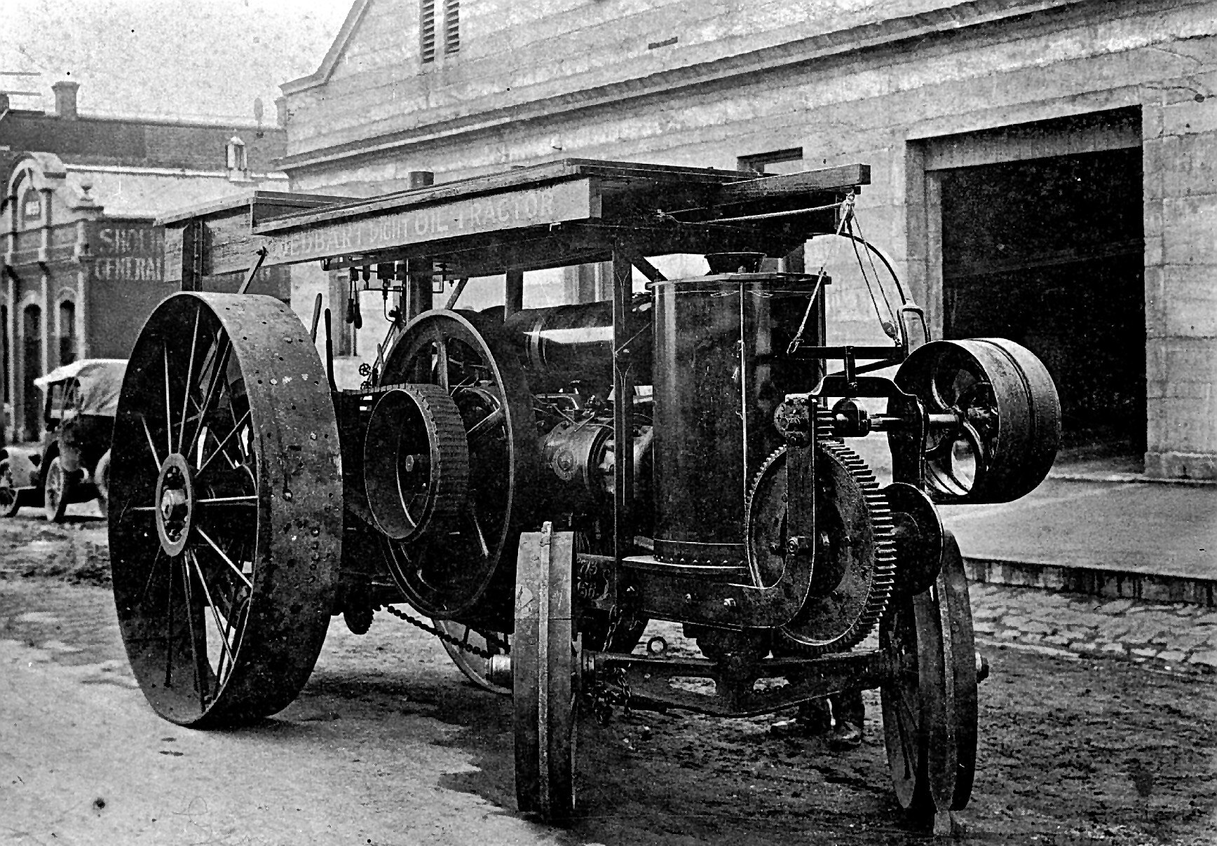 A Jelbart light oil tractor in front of the Jelbart brothers tractor factory.