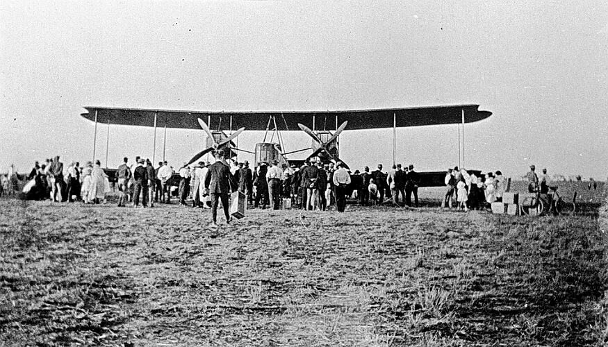 A crowd of people around the Vickers Vimy aircraft flown to 'Portland Downs' station by Sir Keith Smith. (see also MM 00837).