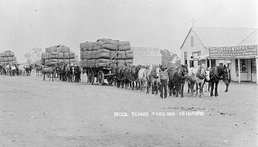 Agricultural Produce, Drays & Wagons, General Stores, Horsedrawn Vehicles, Horses, Signage, Wool Bales, Workers