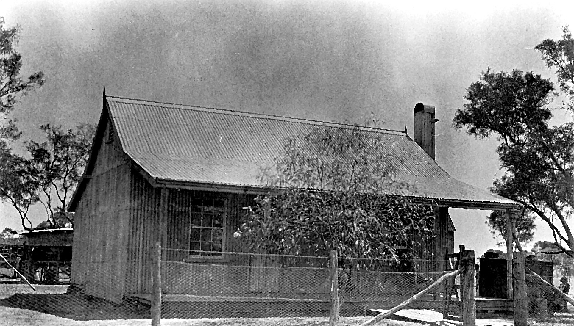 A small house, with a tree growing in front, on 'Portland Downs' station. The house is constructed from corrugated iron.