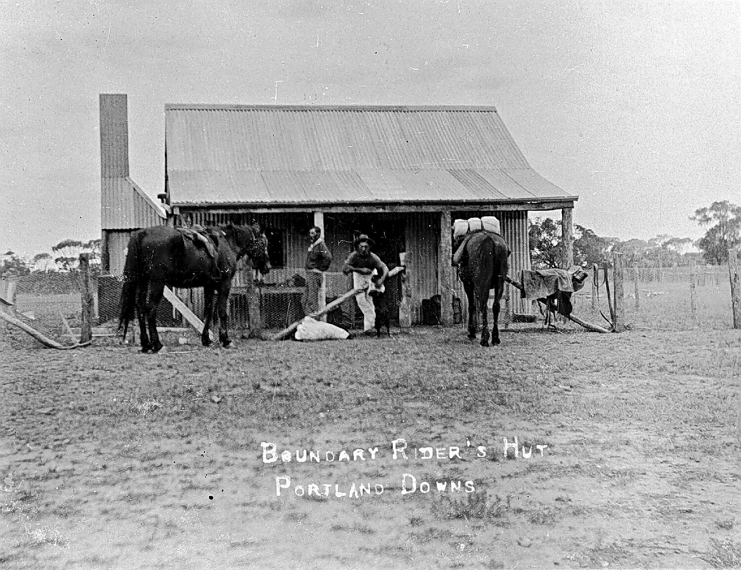 Men and horses outside a hut on 'Portland Downs' station. The hut is constructed from corrugated iron.