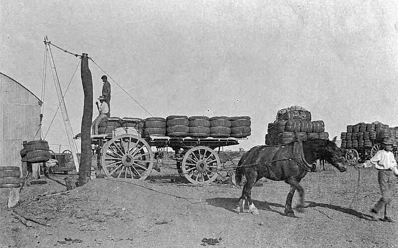 Winching woolbales onto wagons on 'Portland Downs' station the winch is driven by a horse.